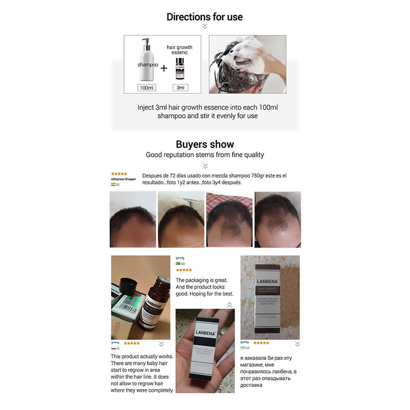 روغن رشد مو Lanbena با فرمولاسیون بسیار کامل و مواد مغذی حاوی عصاره زنجبیل، جنسینگ، روغن هسته انگور و رزماری موهای نازک تر و ضعیف تر را تقویت کرده و در نتیجه موهای شما ضخیم تر شده و نمی شکند. این محصول میتواند ریشه های مو را فعال کرده، میکرو مولکول های گیاهی را به ریشه مو برساند و از تشکیل فیبر کلاژن در اطراف ریشه مو جلوگیری کند.