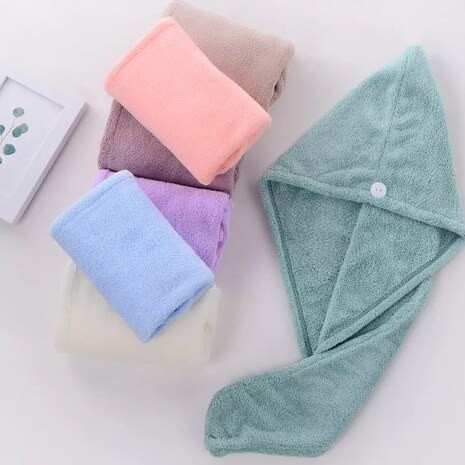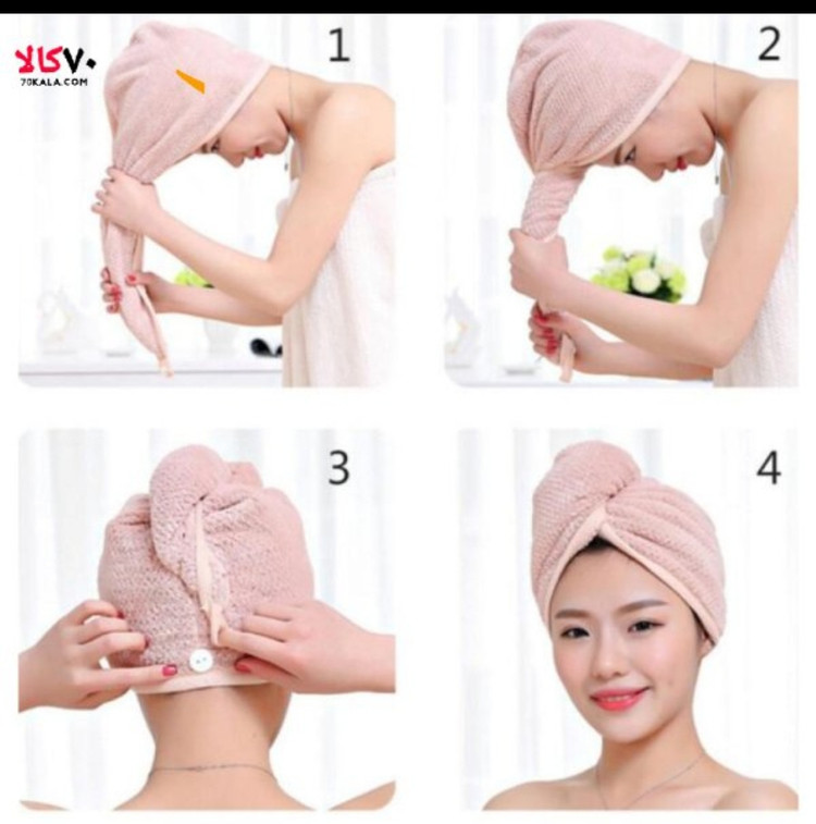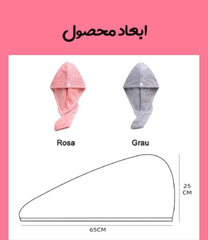 حوله خشک کن مو یکی از محصولات خلاقانه و کاربردی حمام برای خانم ها که معضل خشک کردن موهای بلند را دارند. جنس این حوله خشک کننده مو دکمه دار از میکروفایبر با جذب بالای آب می باشد و به طول ۵۹.۵ سانتی متر است که با پیچیدن مو در آن سریع تر و راحت تر موها خشک می گردند/