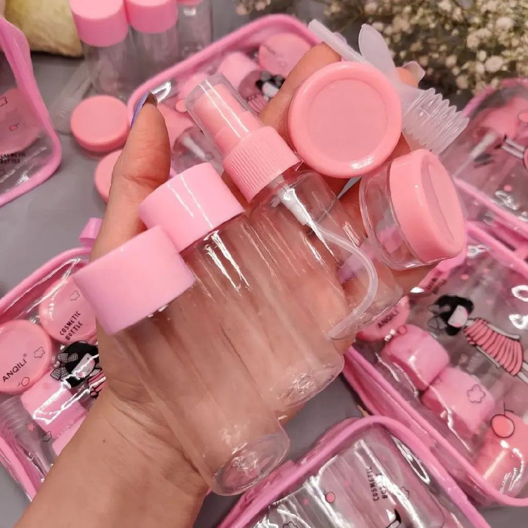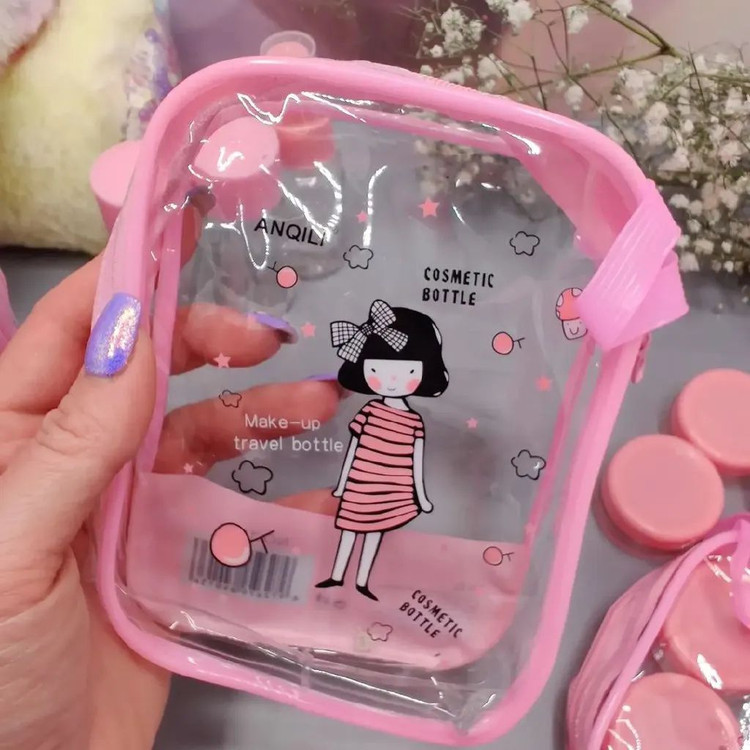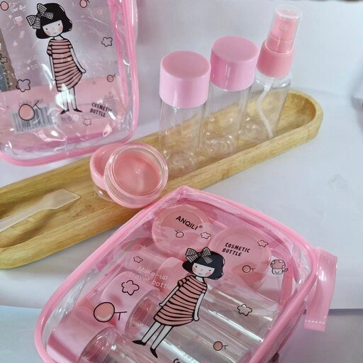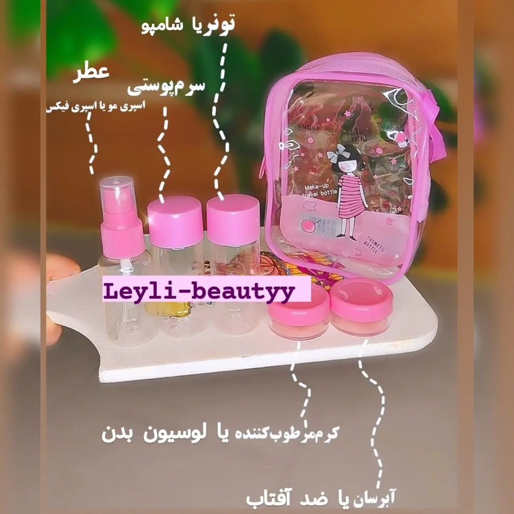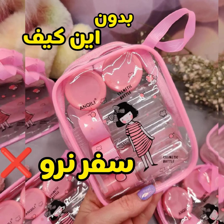 مشخصات: کیفش زیپ داره و خیلی جنسش عالیه یک عدد اسپری مناسب ( الکل، میسلارواتر، تونر و … ) دو عدد بطری قفل شونده ( شامپو، فیس واش و … ) دو عدد کاسه کوچک مناسب ( انواع کرم، پودر فیکس، ماسک، آبرسان و .. ) دارای یک کاردک و قطره چکان (برای پر کردن بطری ها)
