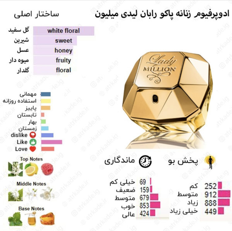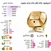 پس از استفاده عطر لیدی میلیون Lady belion روونا بروی پوست یا لباستان متوجه بوی تمشک ، لیمو و شکوفه های نارنج خواهید شد. این ترکیب شیرین باعث به وجود آمدن شادی و نشاط درشما می شود. پس ازمدتی رایحه میانی باترکیب گل یاسمن ، گارنیا و شکوفه های پرتقال طراوت و تازگی را برای شما به ارمغان می آورد و درنت انتهایی که از گیاه جادویی پاتچولی ، عسل و عنبر تشکیل شده اند. نت های گرم و شیرین و کمی تند عطر ادکلن لیدی میلیون Lady belion انرژی و هیجان خوبی را به شما منتقل می کند.