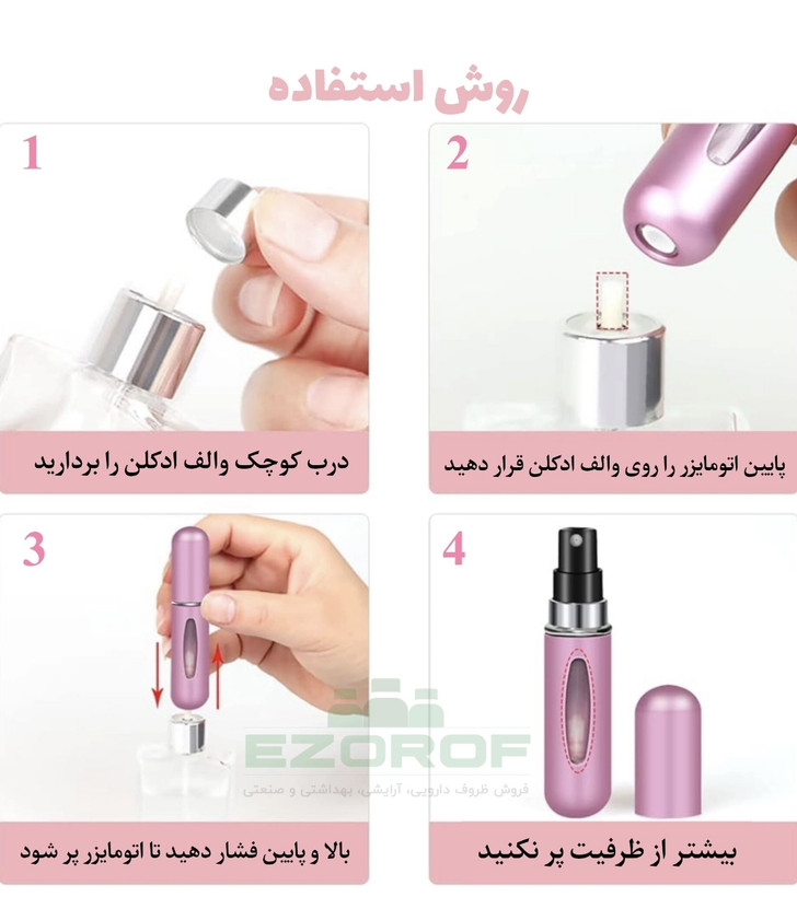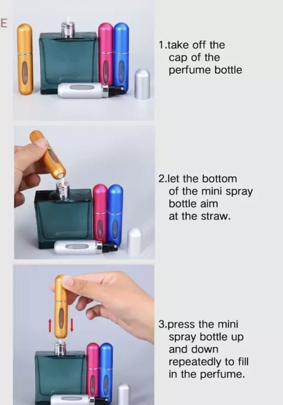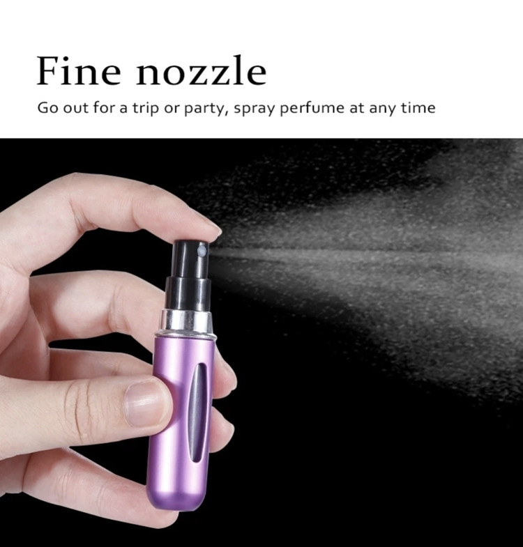 با این اتومایزر، به سادگی قسمت اسپری شیشه عطر یا ادکلن خود را برداشته و اتومایز عطر را از انتها بر روی شیشه ادکلن قرار داده و چند مرتبه فشار دهید تا مخرن آن به مقدار دلخواه شارژ شود. این محفظه نگهدارنده عطر جیبی علاوه بر سبکی مقاومت بسیار خوبی دارد و کیفیت آن به گونهای است که هیچ گونه نشتی و هدررفت ادکلن و عطر در هنگام شارژ و یا حمل بطری عطر نخواهید داشت. حجم محفظه این اتومایزر 5 میلی لیتر است.